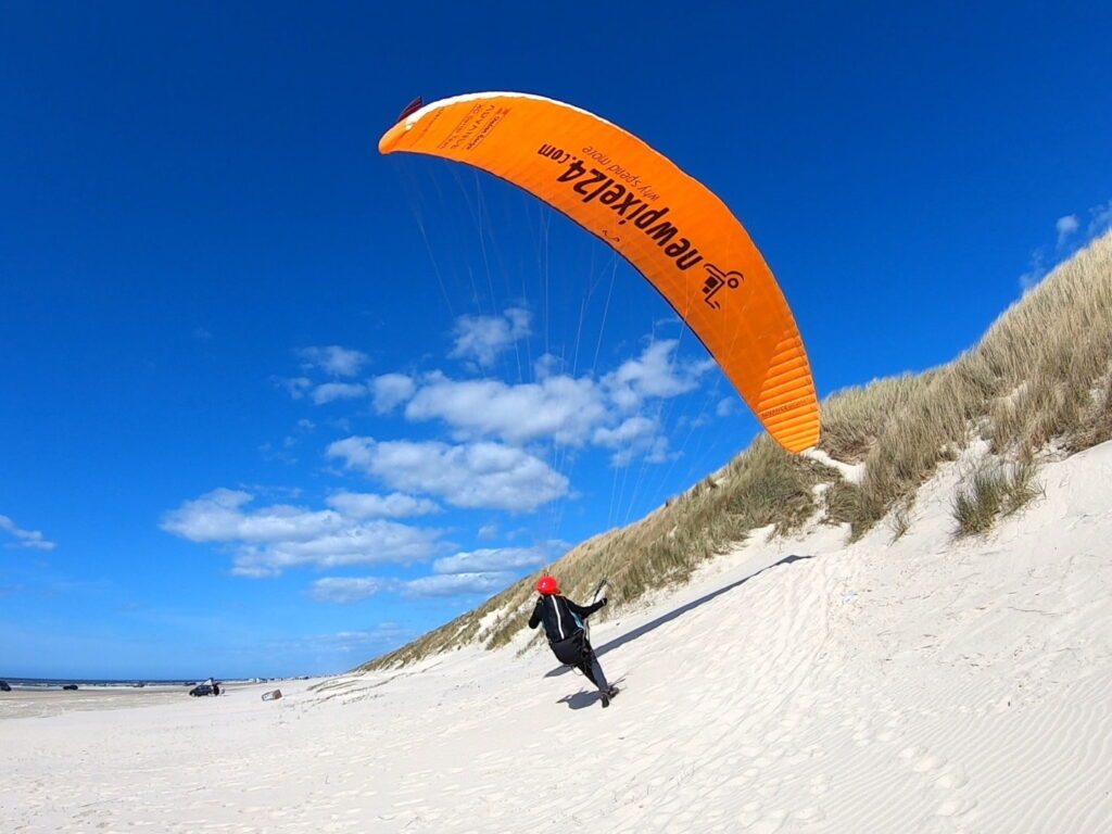 Der Plan ist aufgegangen – ich freu mich, dass ich diesen mega Tag hier erleben darf. Und die ganze über 3 km lange Kante gehört mir alleine, keine weiteren PilotInnen sind in der Luft. Ganz am nördlichen Ende bei Ferring ist Sören, eine Däne mit seinen Segelflugmodellen am Fliegen, aber wir haben eine gute Absprache getroffen, so dass wir uns nicht gefährden. Und am Startplatz übt Mario, wie er am Besten in die Luft kommt.