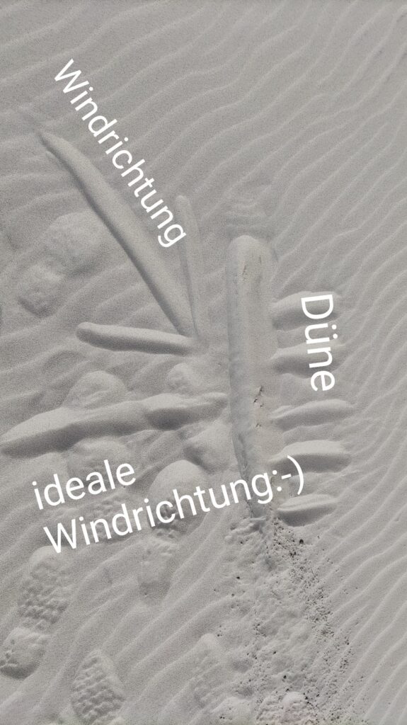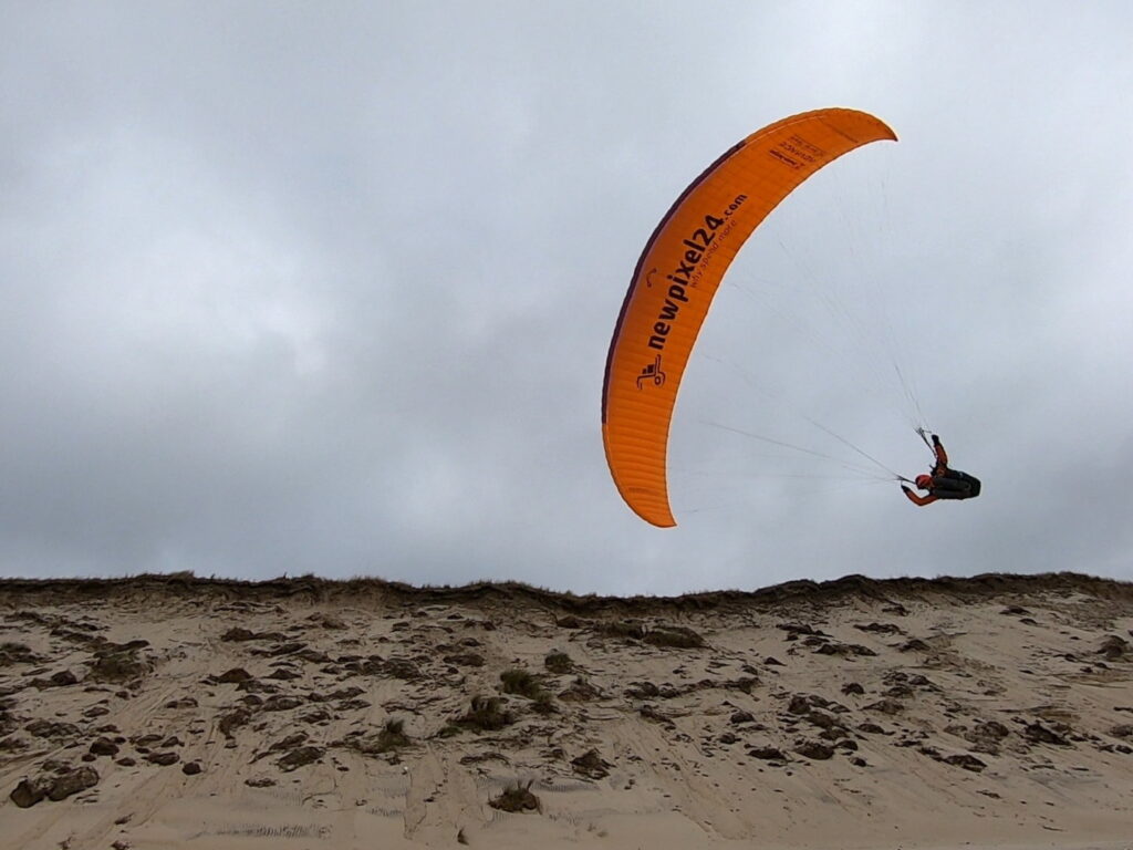 Von Zeit zu Zeit überprüf ich in der Luft, ob der Wind zu stark wird. Dazu wähle ich eine Flugrichtung direkt in den Wind und lass den Schirm ungebremst und unbeschleunigt im Trimspeed gleiten. Wenn ich so voll gegen den Wind noch Vorwärtsfahrt über Grund mache, ist alles gut, denn ich hab immer noch eine Geschwindigkeitsreserve von konservativ 10 km/h durch meinen Fusstrimmer/Beschleuniger. Damit kann ich dann zur Not zur See hin von der Kante wegfliegen und im windschwächeren Bereich am Strand landen. Ausgereizt wird das aber nicht. Als meine Geschwindigkeit über Grund nur noch Schrittgeschwindigkeit beträgt weiss ich, dass es nun mit ca 30 km/h bläst. Zeit für mich, landen zu gehen.