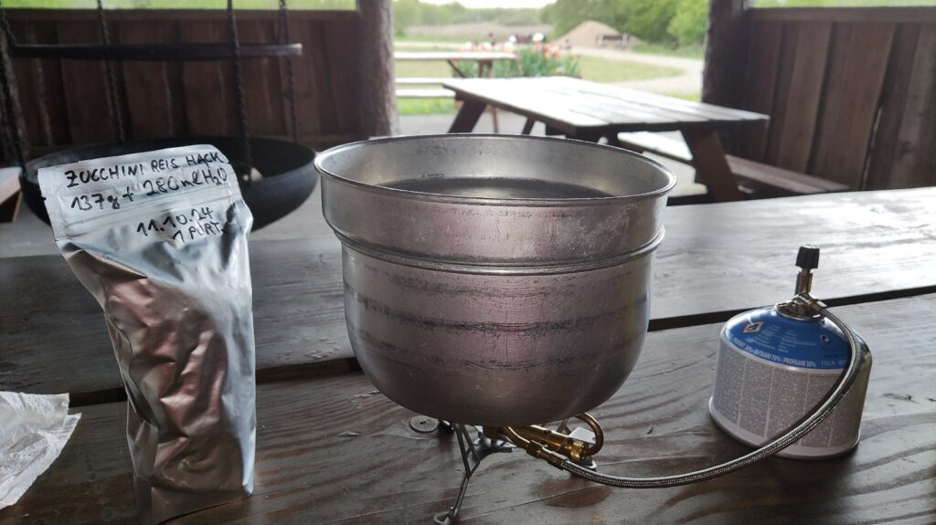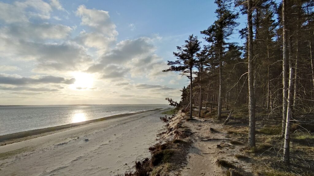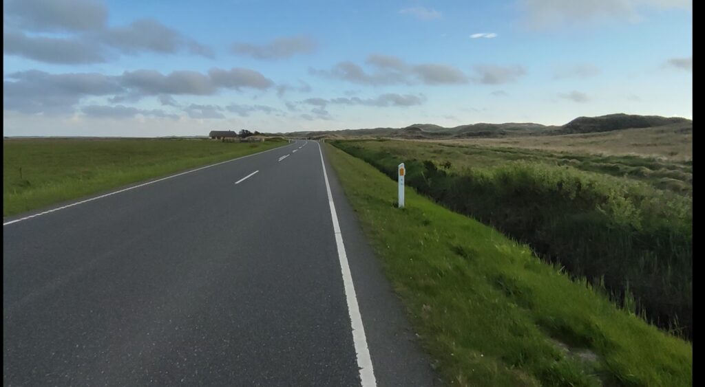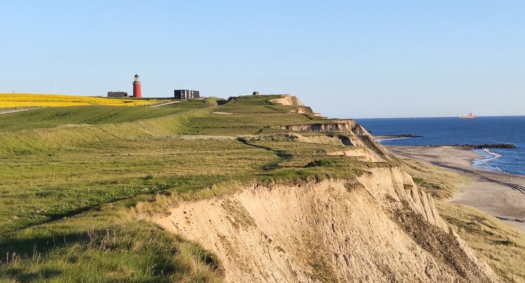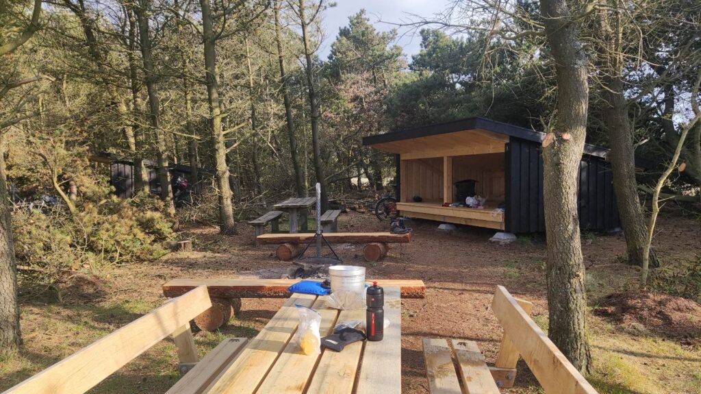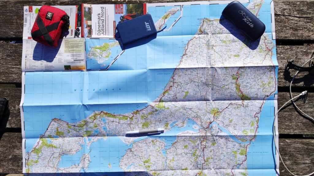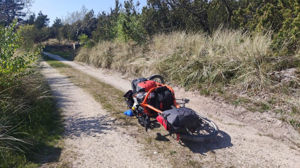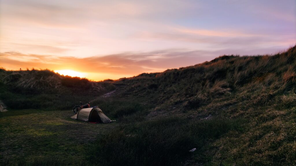 Heute hab ich ich mir mal einen Wecker gestellt – ich geh immer noch davon aus, dass ich nur vormittags ein kurzes Zeitfenster haben werde, in dem die Windstärke für einen entspannten Flug an der Steilküste von Bovbjerg passend sein wird. 6 Uhr 15 ist Tagwache, kurzes Frühstück, und dann geht’s los. Meine Ausrüstung, die ich nicht brauche, bleibt im Shelter zurück.