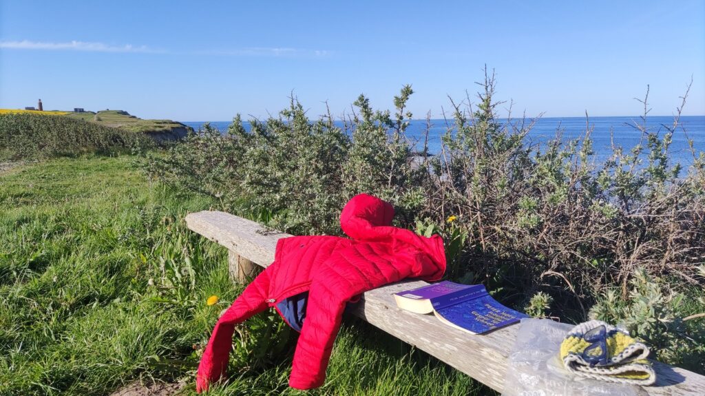 Pünktlich um 8 steh ich am Startgelände in Ferring und mach mich mit dem Startplatz oben auf der Steilküste, der Umgebung und den Landemöglichkeiten vertraut. Noch ist Parawaiting angesagt, der Wind ist noch nicht stark genug, weht aber schon aus der genau richtigen Richtung. Zur Verkürzung der Wartezeit ist meine Reiselektüre mit am Startplatz und ich genieße eine morgendliche Lesestunde in der Sonne.