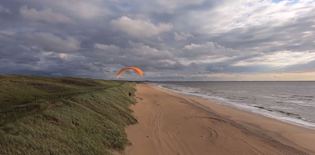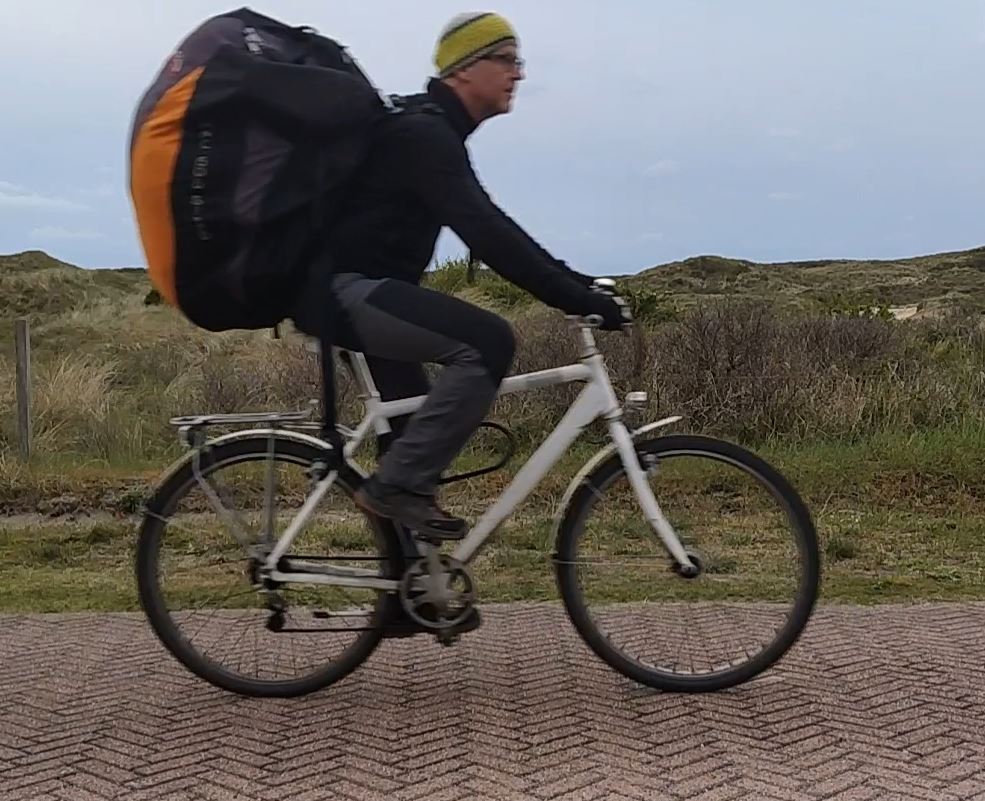 Als jemand, der die unkomplizierte und ressourcenschonende Fortbewegung per Fahrrad liebt, bin ich in Holland sozusagen in meinem natürlichen Habitat angekommen. Da war es nur noch ein kleiner und unumgänglicher Schritt, meine Gleitschirmausrüstung auf dem Fahrrad mitzunehmen. 45 Minuten dauerte die Fahrt von unserem zu Hause durch die wunderschöne Dünenlandschaft bis zu dem Küstenabschnitt im Norden Den Haags, der für uns Gleitschirmflieger zugängliche Dünen mit ausreichender Neigung und Höhe bereit hält.